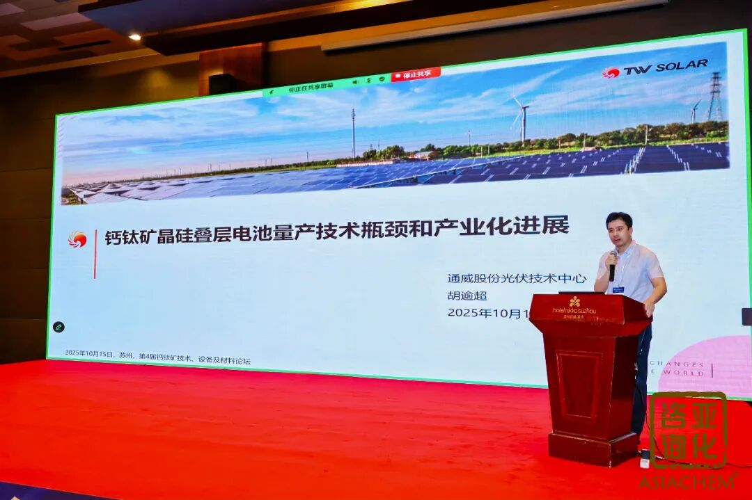 10月14-16日,由亞化咨詢主辦的第四屆鈣鈦礦技術、設備及材料論壇在江蘇蘇州舉行。本次論壇聚焦鈣鈦礦組件的應用場景與市場潛力,深入探討全球及中國鈣鈦礦技術領域的最新科研進展與產業化成果等內容。通威股份光伏技術中心鈣鈦礦電池主任研發工程師胡逾超博士受邀出席并作主題演講。